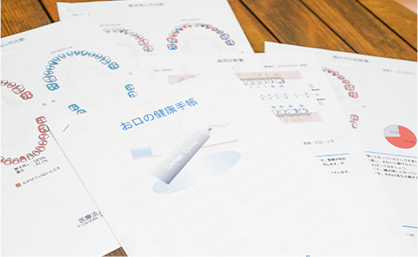 当院では、コンピューターによってお口の状態や磨き残しを管理し、そのデータを表やイラスト化して患者様にお渡ししています。