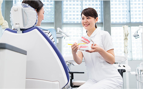 口腔内の状態や生活習慣などを確認させていただき、患者様お一人おひとりに合ったブラッシング法や清掃用具の選び方などをお伝えさせていただきます。ブラッシングはむし歯菌が活発化する食後30分までに行いしっかり汚れを落とすことでむし歯予防に繋がります。